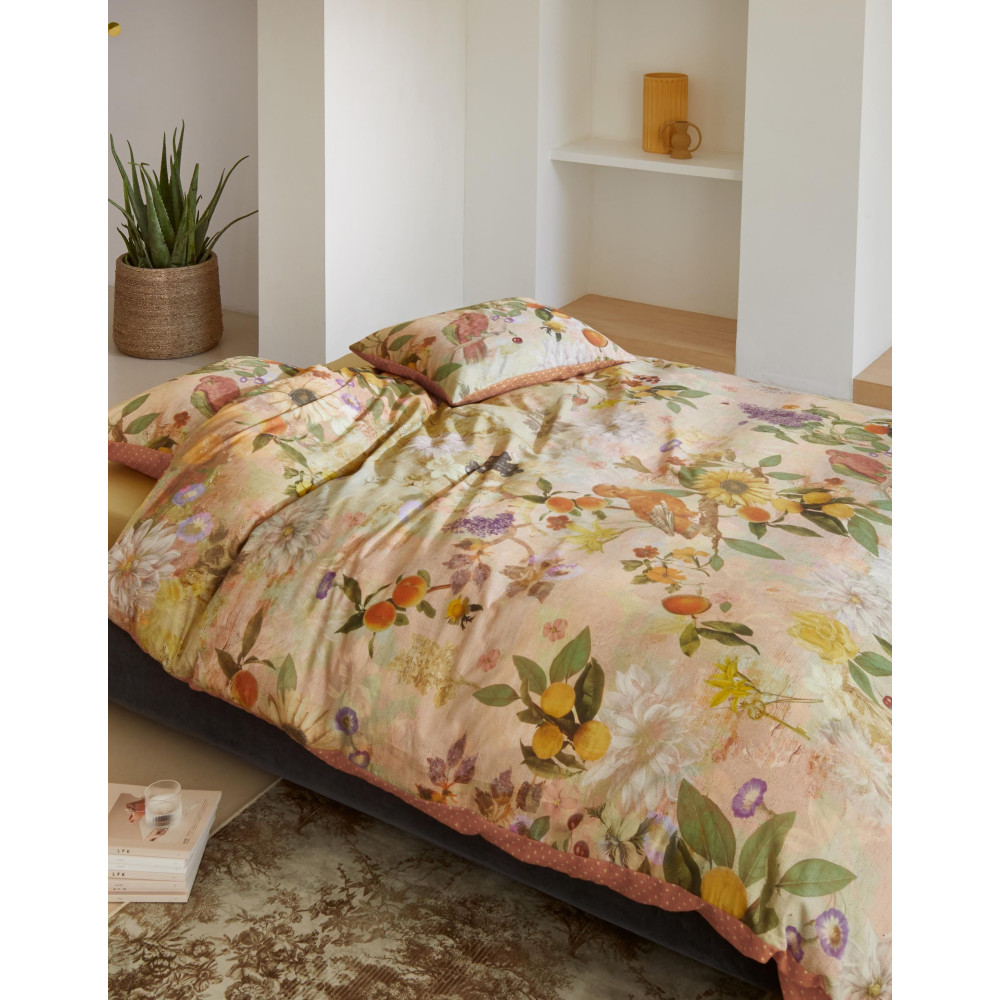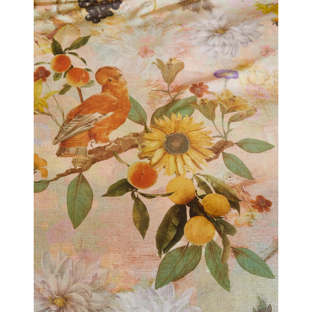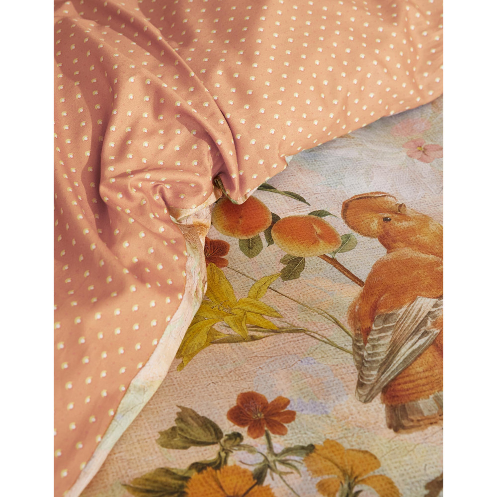 Povlečení s jedinečným přírodním motivem na lososově růžovém pozadí působí velmi optimistickým dojmem. Na přední straně povlečení se můžeme kochat nejrůznějšími obrázky květin, ovocných plodů či ptactvem, zadní strana je tmavěji lososově růžová s drobnými grafickými puntíky. Prohlédněte si detailní fotografie, potisk jim přesně odpovídá. Nechte se unést relaxační atmosférou, která dýchá z této krásné ložní soupravy a dopřejte si zdravý spánek v povlečení mimořádné kvality.