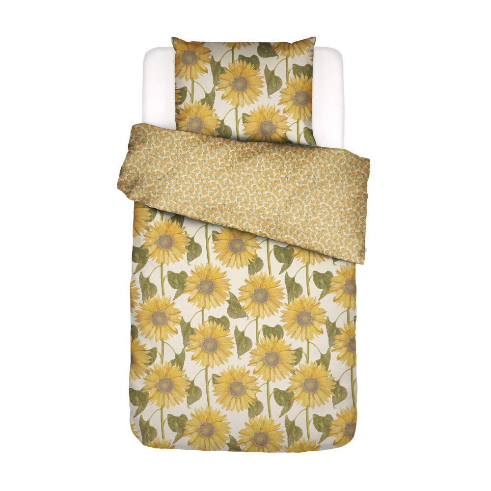 Povlečení s moderním a nadčasovým designem zaujme především milovníky květinových vzorů výraznějších vzorů. Přední strana povlečení je poseta velkými obrázky slunečnic na světle krémovém pozadí, na straně druhé je drobný květinový vzor. Potisk obou stran je odlišný a odpovídá fotografiím. Prohlédněte si detailní fotografie skutečného povlečení.