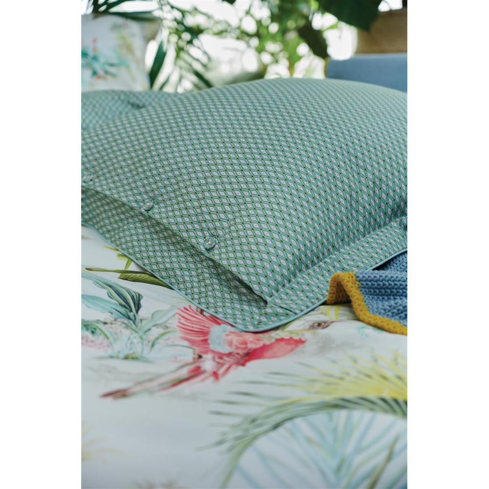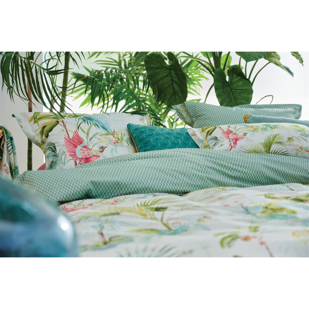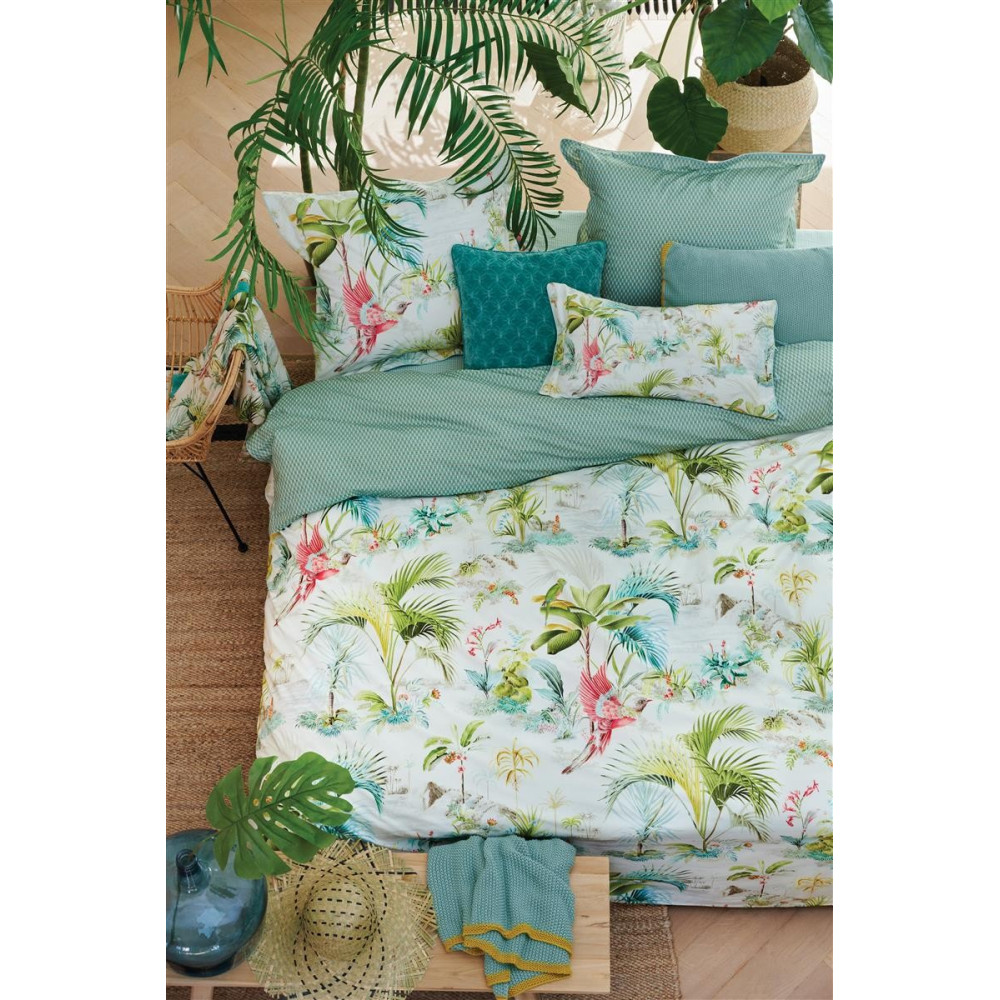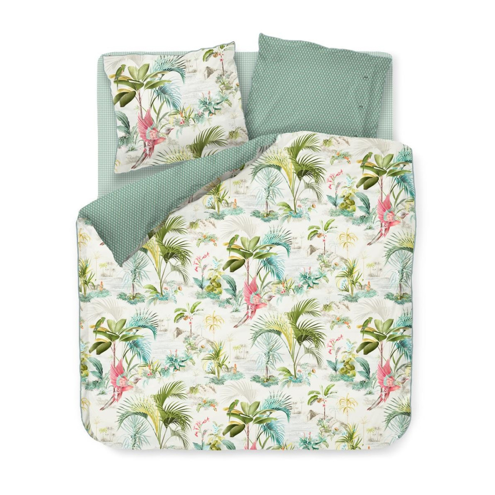 Přední strana povlečení je bílá, plná krásných palem, barevných květin a růžových papoušků. Prohlédněte si detailní fotografie, které se snaží zachytit exotickou atmosféru sálající z této ložní soupravy. Zadní část povlečení je zelenkavá, zdobena drobnými grafickými kvítky.