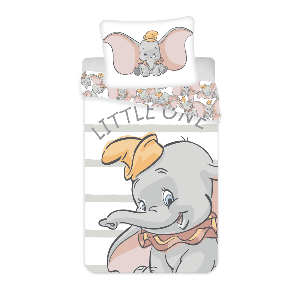 Povlečení Dumbo je roztomilé dětské povlečení, které zútulní každý dětský pokoj. Na přední straně je velký obrázek sloníka na proužkatém pozadí, zadní strana je bílá s malými obrázky se stejným motivem. Ložní souprava je ušita ze 100% hladké bavlny.