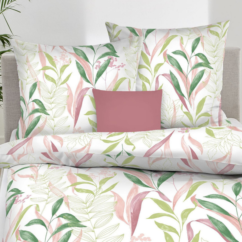 Podklad je čistě bílý a na něm vidíme různé druhy rostlin v odstínech barvy zelené a růžové. Potisk této ložní soupravy je totožný z obou stran. Na obrázku je povlak na polštář čtvercový, ale pro naše zákazníky máme ušitý rozměr 70x90 cm.