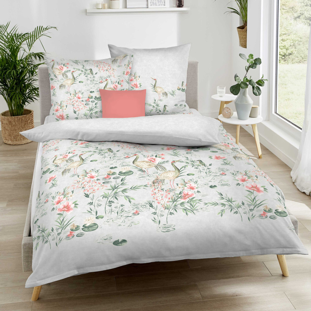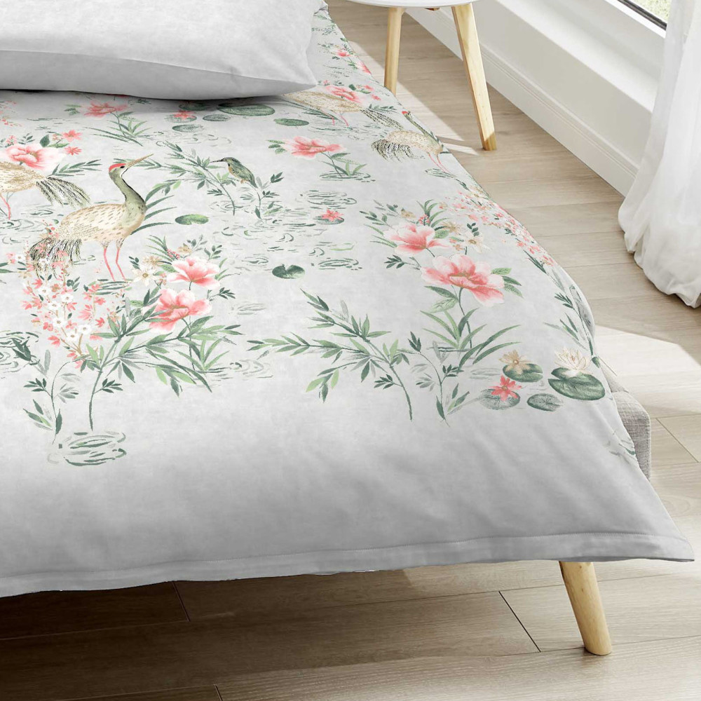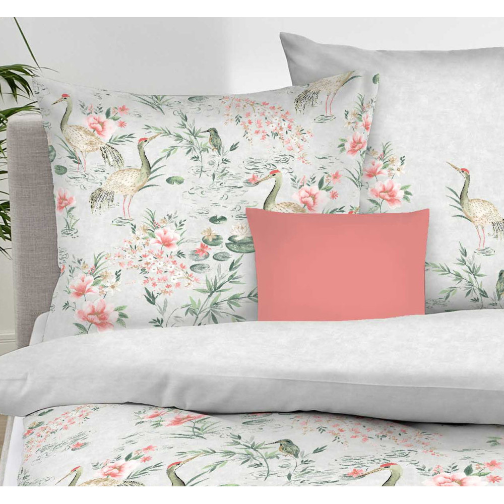 Popis designu: nádherné povlečení s romantickým vzorem s obrázky květin a ptactva na zelenkavém pozadí. Ložní souprava má potisk polštáře odlišný, jak lze vidět na fotografiích.