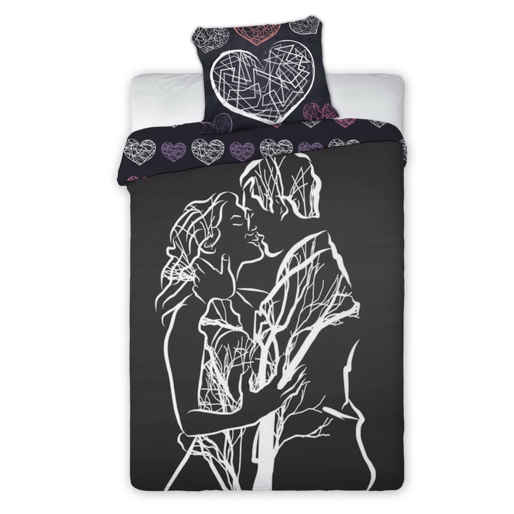 Ložní souprava s romantickým vzorem. Zamilovaný pár v objetí a při polibku na černém pozadí. Povlečení působí dojmem, jako by bylo kreslené tuší. Z druhé strany povlaku na přikrývku jsou drobná růžová srdce na tmavě fialovém pozadí. Vzor na přikrývce je oboustranný, jak je vidět na obrázku.