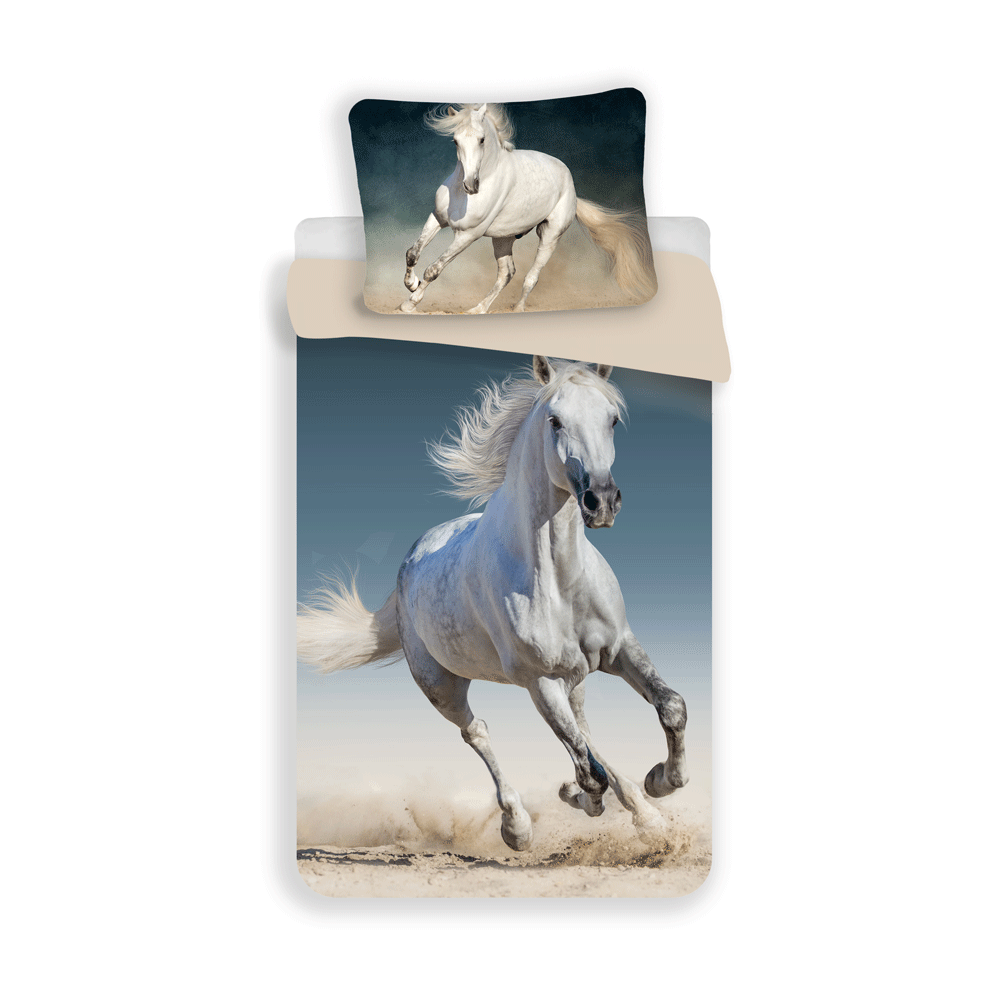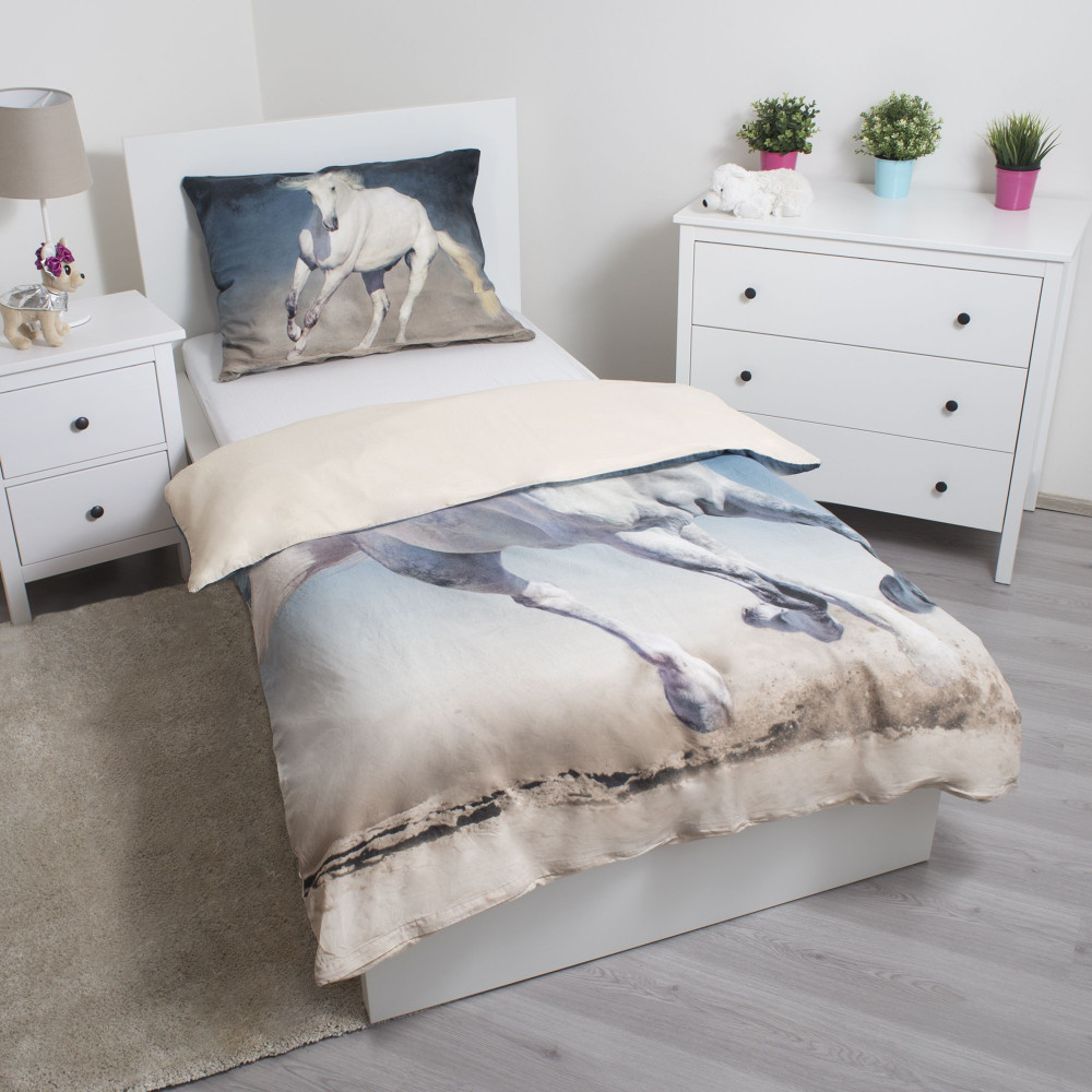 Povlečení Kůň 03 JF je nádherné fototiskové povlečení, které zaujme na první pohled všechny milovníky a milovnice koní. Na přední straně povlaku na přikrývku je akční fotografie běžícího bílého koně, zadní strana je světlounce béžová. Ložní souprava je ušita ze 100% hladké bavlny.