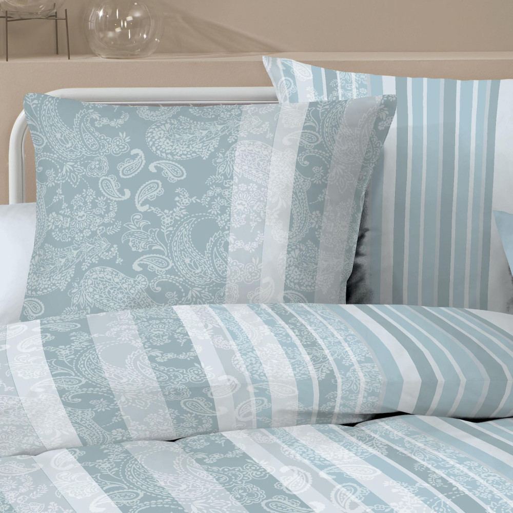 Popis designu: pruhované světle modré povlečení s jemnými květinovými ornamenty