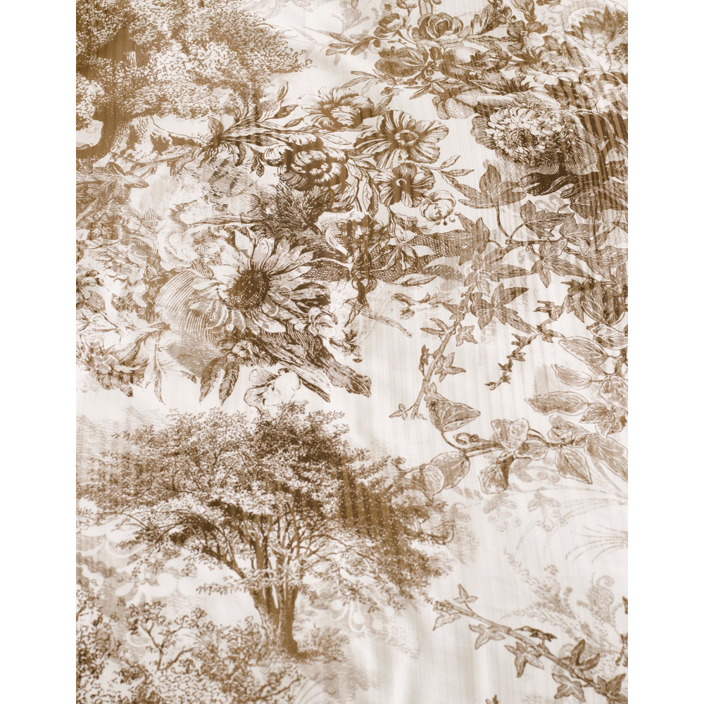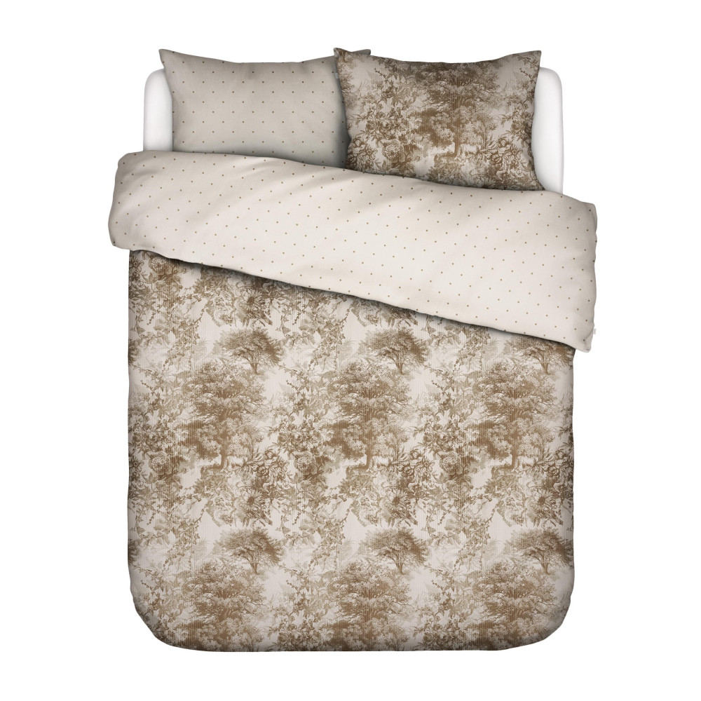 Povlečení s velmi světle béžovým nenápadně pruhovaným podkladem, zdobí tmavěji béžové velké obrázky rostlin a stromků. Zadní strana této ložní soupravy je jednobarevná smetanové s hnědo béžovými tečkami. Prohlédněte si detailní fotografie, které se snaží zachytit jemnost a krásu tohoto dezénu. Povlečení působí velmi jemně a elegantně.