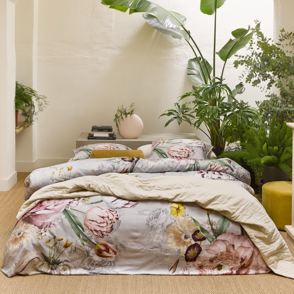 Značkové povlečení z bavlněného saténu Essenza Fleur taupe. Standardní rozměr 140x200, 70x90....