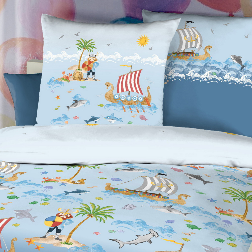 Popis designu - Toto povlečení s dětským motivem zaujme na první pohled. Podklad ložní soupravy je v různých odstínech modré jako moře a obloha a na něm si můžete prohlížet nejrůznější obrázky Wikingů na palmových ostrůvcích, lodí, pokladů, ryb a ptáků. Potěšte své děti a dopřejte jim spánek v tomto krásném a kvalitním povlečení.