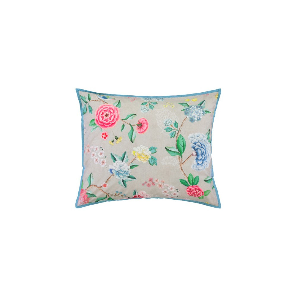Která z krásných květin na této soupravě bude vaše oblíbená? Je velmi těžké se rozhodnout, protože jsou všechny krásné! V růžové, modré, žluté a bílé dodávají čerstvý dotek na khaki pozadí. Vidíte také ptáčka a skrytého motýla? Jasné modré okraje na bocích dotvářejí krásný obraz. Zadní část povlečení je světlá khaki s grafickými kvítky.