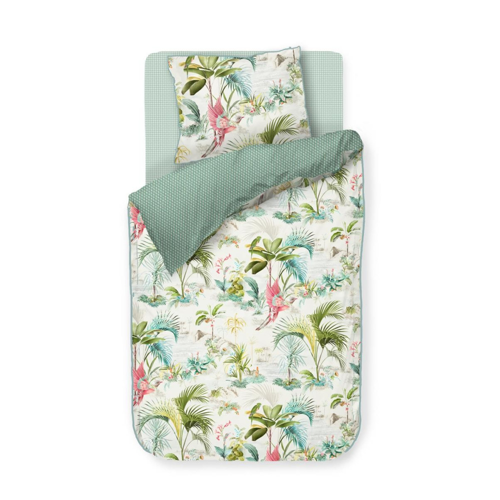 Přední strana povlečení je bílá, plná krásných palem, barevných květin a růžových papoušků. Prohlédněte si detailní fotografie, které se snaží zachytit exotickou atmosféru sálající z této ložní soupravy. Zadní část povlečení je zelenkavá, zdobena drobnými grafickými kvítky.