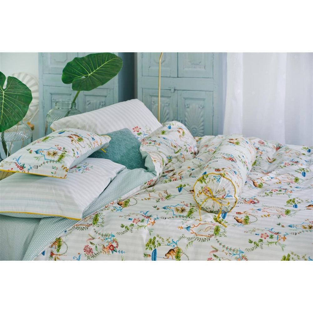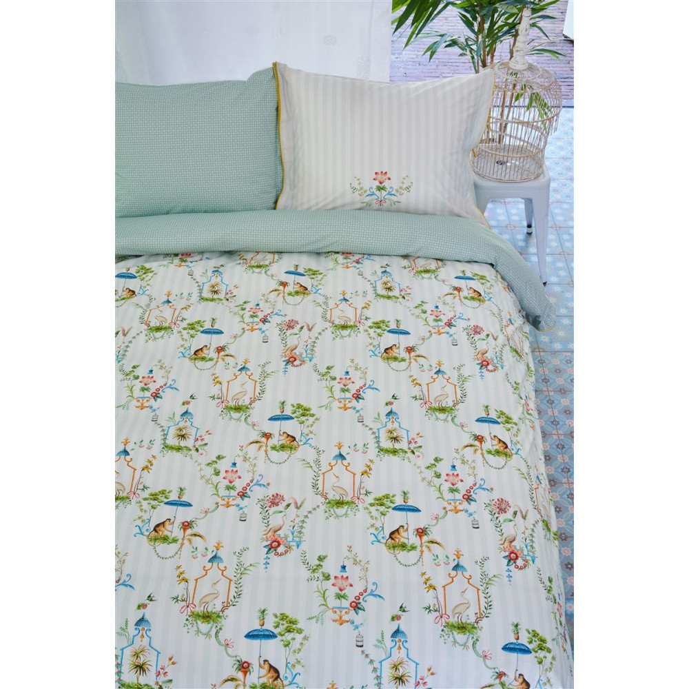 Pozadí přední strany tvoří pravidelné bílé a světlounce zelené pruhy, na které jsou obrázky opic a volavek v záplavě květin a exotických plodů. Zadní část povlečení je též světle zelná, již bez pruhů, zdobena drobnými grafickými kvítky. Polštáři dominuje jedna velká květina na pruhovaném pozadí.